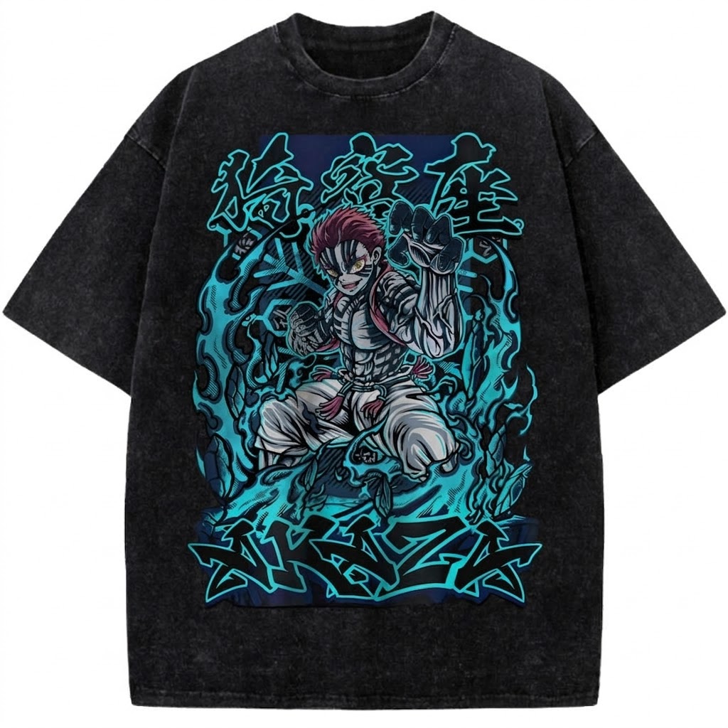 Akaza Demon Slayer Vintage Washed Anime Tee Upper Moon Demon Battle Graphic Streetwear T-Shirt