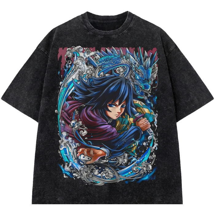Giyu Tomioka Anime Vintage Washed Tee , Demon Slayer Manga Streetwear Shirt Japanese Distressed Oversized T-Shirt