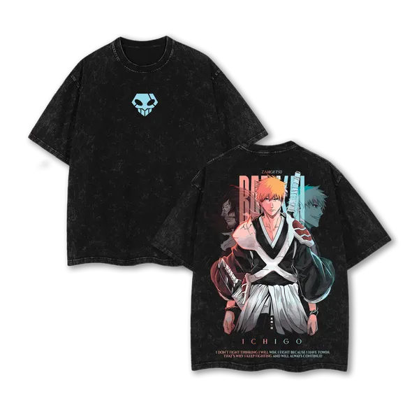 Ichigo Kurosaki Bleach Soul Reaper Anime Vintage Acid Washed T-Shirt Double Printed Manga Graphic Tee Oversized