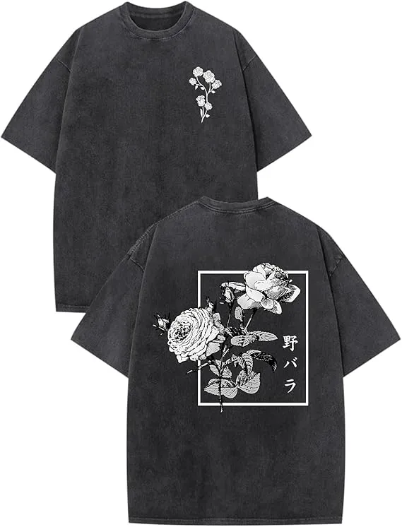 Japanese Rose Flower Vintage Washed Oversized Anime Harajuku Streetwear Graphic T-Shirt