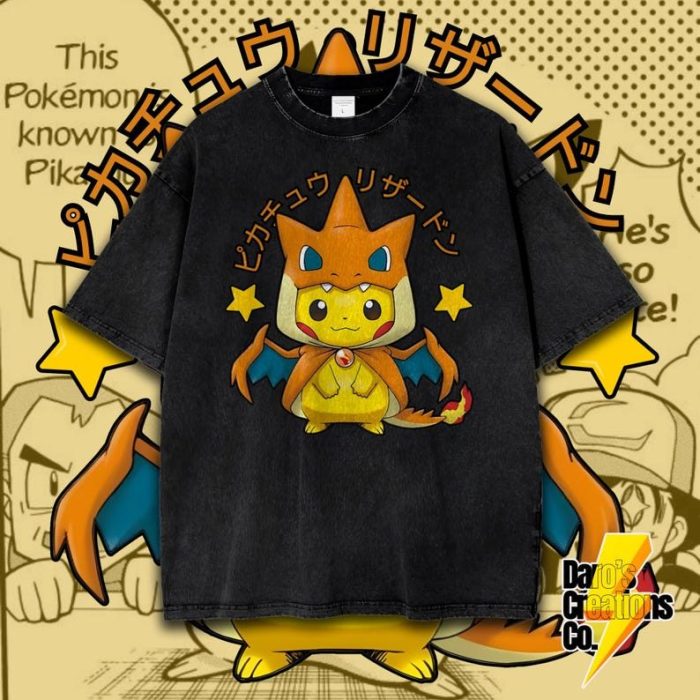 Pikachu Charizard Poncho Pokemon Anime Character Vintage Washed T-Shirt Retro Anime Graphic Tee