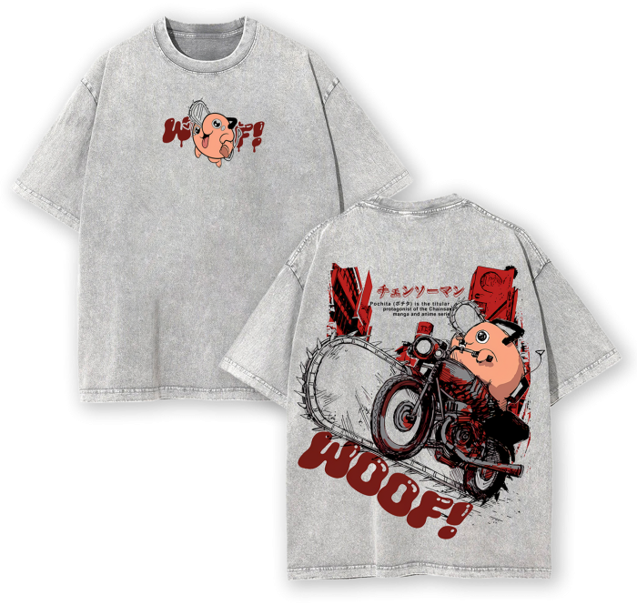 Pochita Chainsaw Man Anime Vintage Washed Tee WOOF Cute Dog Manga Streetwear Oversized Shirt